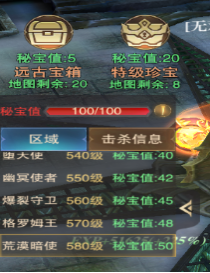 該BOSS玩法的進(jìn)入副本后也是擁有100點(diǎn)秘寶值,也是該游戲魂器以及魂器材料產(chǎn)出的唯一途徑,激活魂器能給與角色很大的屬性加成,建議開啟該玩法后,每天都把次數(shù)刷完! 除BOSS以外,還有遠(yuǎn)古寶箱和特級(jí)珍寶可供玩家采集,但采集寶箱也同樣需要消耗秘寶值,詳情可見下圖。且該副本的BOSS挑戰(zhàn)難度較高,擊殺會(huì)比較耗時(shí)。(PS:按照物品掉落的稀有程度,優(yōu)先級(jí)可以分為:副本BOSS≥特級(jí)珍寶>遠(yuǎn)古寶箱)