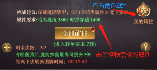 要擊殺副本中的怪物,需要滿足副本怪物的屬性要求,否則會(huì)被副本中的怪物“秒殺”。所以我們挑戰(zhàn)副本需要根據(jù)副本頁(yè)面右側(cè)的“我的屬性”一欄,查看角色的屬性值,來挑選副本中合適的怪物進(jìn)行擊殺,待滿足了下一層怪物的屬性要求后,再進(jìn)行前往挑戰(zhàn)。層數(shù)越高的怪物,屬性要求會(huì)越高?