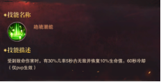 其中 ?絕境潛能-受到致命傷害時,有30%幾率5秒內(nèi)無敵并回復(fù)10%的生命值。60秒冷卻時間(僅pvp生效)